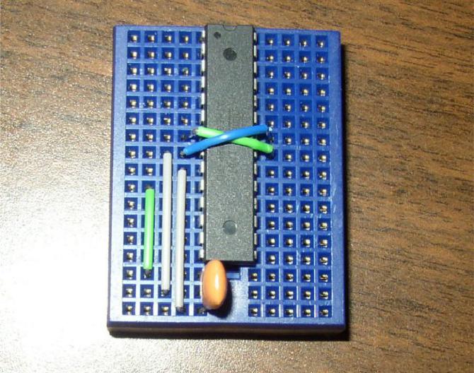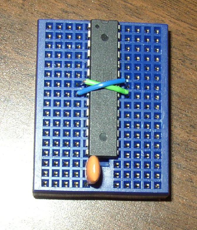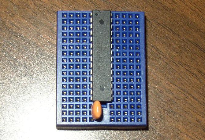 Put the ATMega328 in the breadboard, with the little semicircular cutout facing one end of the breadboard.
